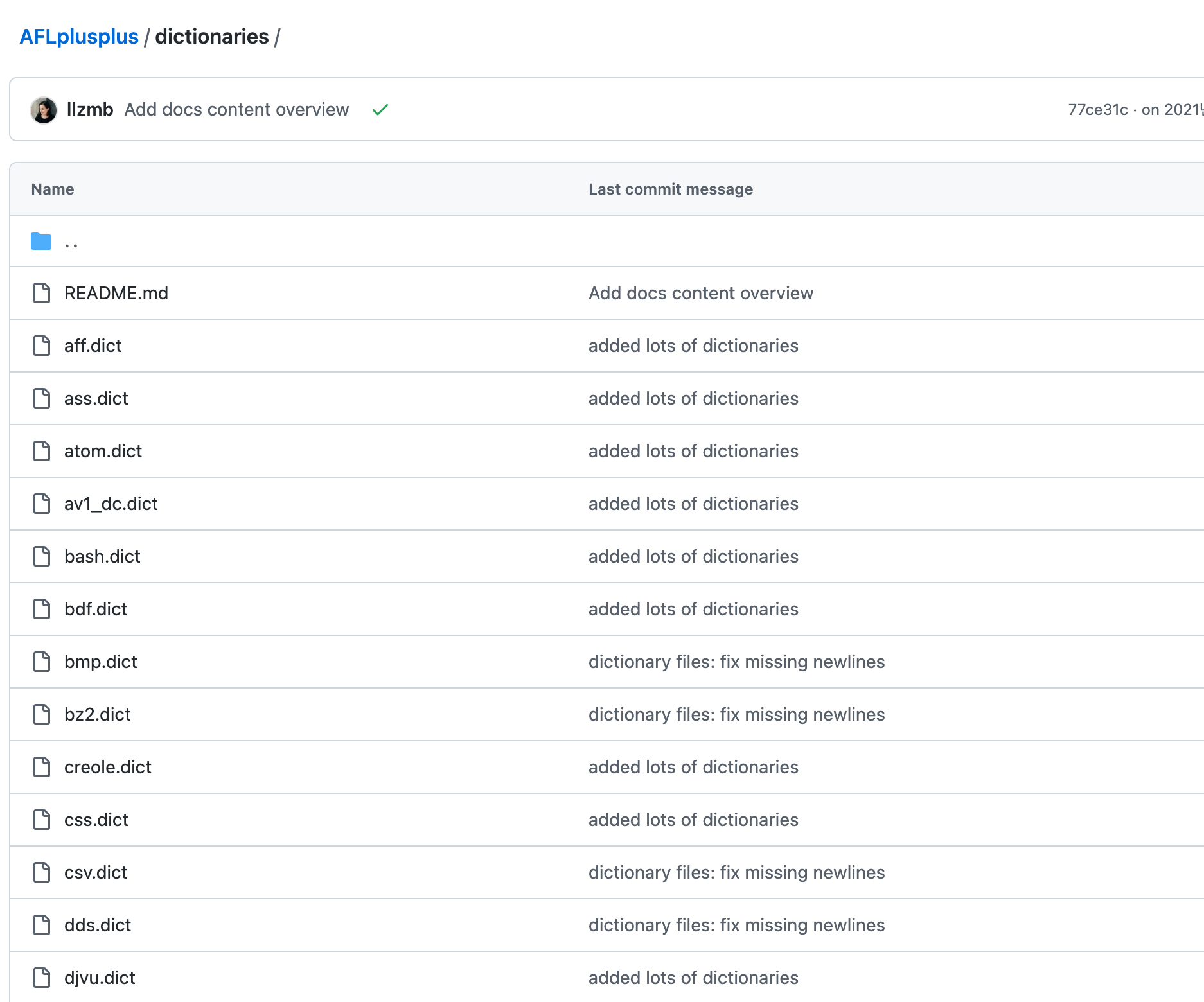 AFL++에서는 다양한 파일 포맷에 대한 딕셔너리를 제공해준다.