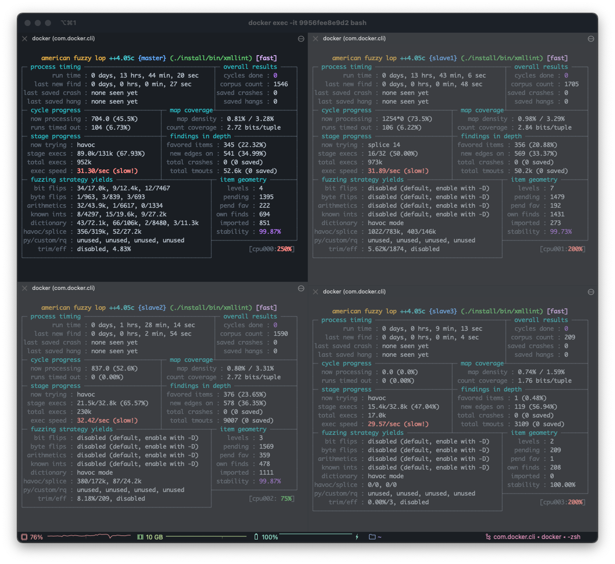 afl-fuzz -m none -i ./afl_in -o afl_out -s 123 -x ./dict/xml.dict -D -M master -- ./install/bin/xmllint --memory --noenc --nocdata --dtdattr --loaddtd --valid --xinclude @@
