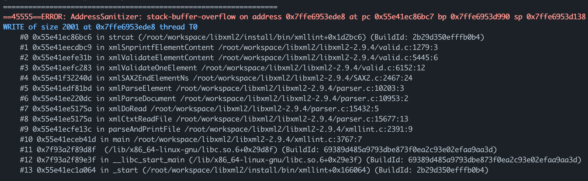 ```(gdb) p (xmlElementContent)0x604000000310 $9 = {type = XML_ELEMENT_CONTENT_ELEMENT, ocur = XML_ELEMENT_CONTENT_ONCE, name = 0x62a00000293b ‘l’ <repeats 200 times>…, c1 = 0x0, c2 = 0x0, parent = 0x1, prefix = 0x62a00000199a ‘p’ <repeats 200 times>…}